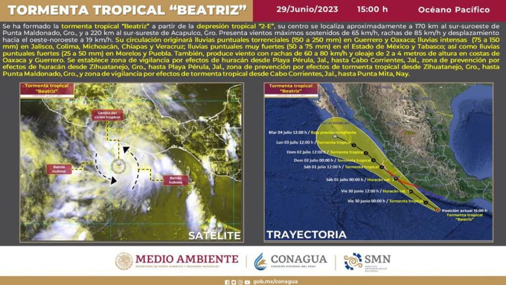 Con vientos máximos sostenidos de 65 km/h y desplazamiento hacia el oeste-noroeste a 19 km/h, se espera que «Beatriz» se fortalezca y alcance la categoría de huracán de categoría 1 para este viernes.
