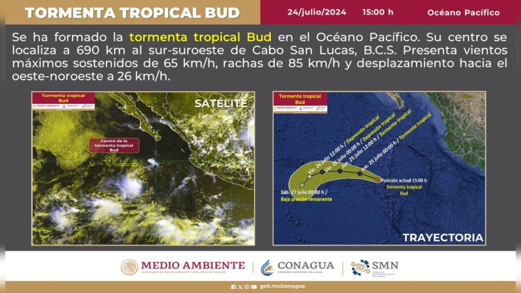 El Servicio Meteorológico Nacional (SMN) informó a las 15:15 horas sobre la formación de la tormenta tropical Bud en el Océano Pacífico.