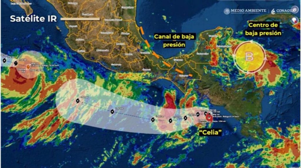 En su momento, la coordinadora general del Servicio Meteorológico Nacional, de Conagua, Alejandra Margarita Méndez Girón, explicó que a las 16:00 horas, tiempo del centro de México, Celia se localizó aproximadamente 425 km al sureste de la desembocadura del Río Suchiate, en la frontera entre México y Guatemala, con vientos máximos sostenidos de 65 kilómetros por hora (km/h), rachas de 85 km/h y desplazamiento hacia al norte a 6 km/h. En tanto, en el mar Caribe, la zona de baja presión con potencial ciclónico se localizó a 260 km al sureste de Chetumal, Quintana Roo.