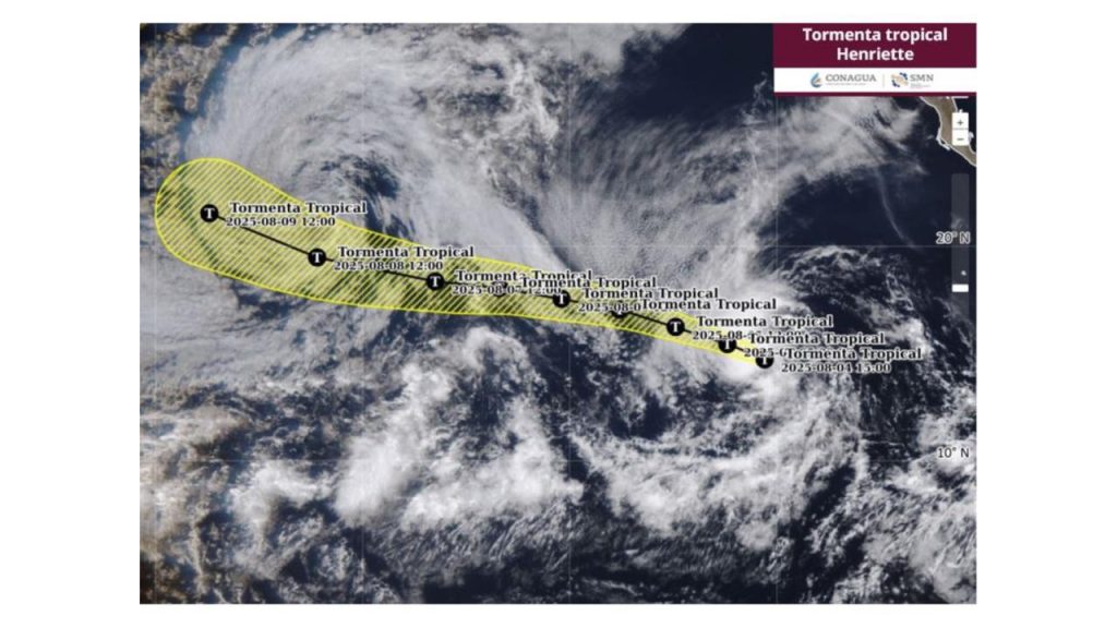 De acuerdo con el reporte de las 15:00 horas, el centro de Henriette se localiza a 1,440 kilómetros al suroeste de Cabo San Lucas, Baja California Sur. El sistema registra vientos máximos sostenidos de 75 kilómetros por hora, rachas de hasta 95 kilómetros por hora y avanza hacia el oeste-noroeste a una velocidad de 24 kilómetros por hora.
