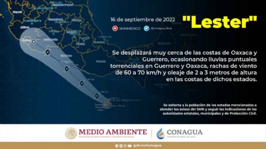 Durante las primeras horas del 16 de septiembre de 2022, la depresión Tropical «TRECE – E» se ha intensificado a la Tormenta Tropical «Lester» en el Océano Pacífico, de acuerdo con la información de la Comisión Nacional del Agua (Conagua) y el Servicio Meteorológico Nacional (SMN).