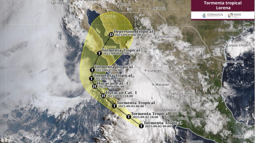 El Servicio Meteorológico Nacional (SMN) informó que la depresión tropical Doce-E se intensificó a la tormenta tropical Lorena en el océano Pacífico nororiental. Emitido a las 12:00 horas del mediodía del 2 de septiembre de 2025, su centro se localiza a 360 km al oeste de Playa Pérula, Jalisco, y a 490 km al sur-sureste de Cabo San Lucas, Baja California Sur, con vientos máximos sostenidos de 75 km/h, rachas de 95 km/h y desplazamiento hacia el noroeste a 22 km/h.