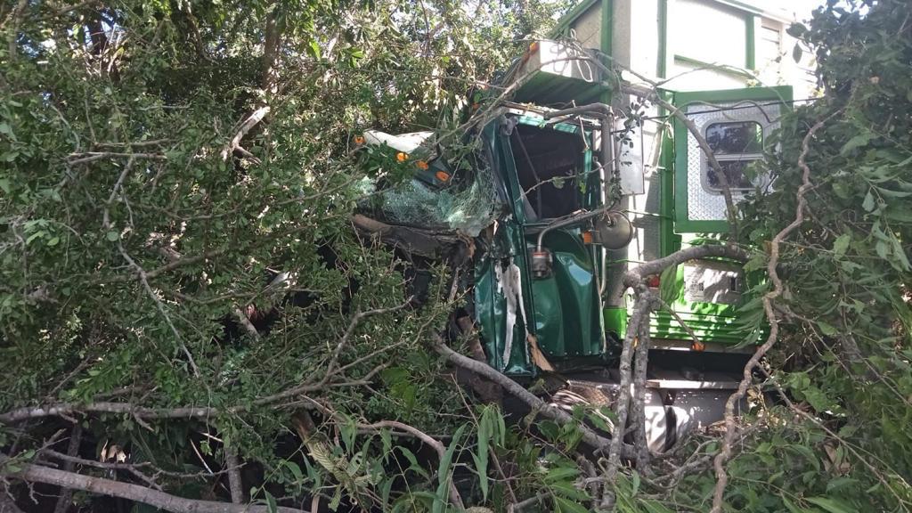 Los Ángeles Nayaritas de la Policía Estatal, tras recibir la alerta, se dirigieron al lugar del suceso, donde encontraron un Torton de la marca Internacional, modelo 2010, de color verde, impactado contra un árbol fuera de la cinta asfáltica.