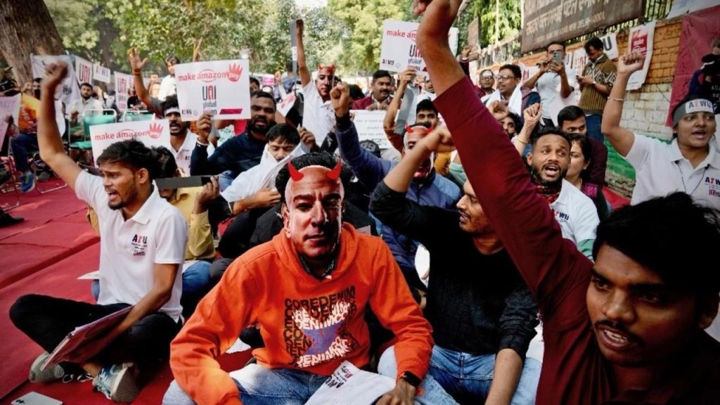 Alrededor de 200 trabajadores de almacén y conductores de entrega se congregaron en la capital, Nueva Delhi, bajo una pancarta que decía “Hacer que Amazon pague”. Algunos llevaban máscaras del director de Amazon, Jeff Bezos, y se unieron de manos contra las prácticas de la compañía con sede en Seattle