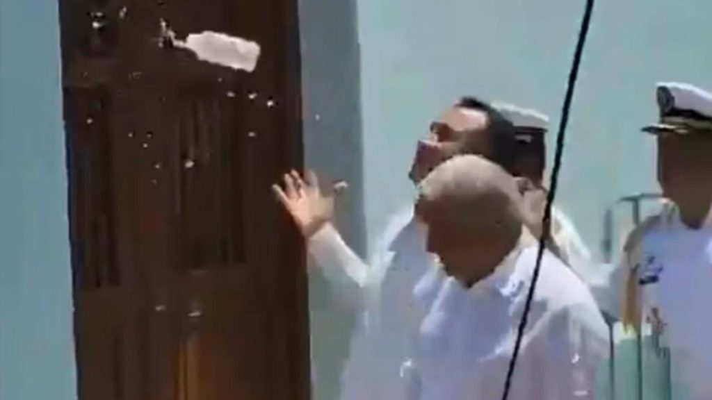 Cuando el mandatario ingresaba al recinto, acompañado del gobernador Cuitláhuac García, y el secretario de la Marina, José Rafael Ojeda Durán, alcanzó a esquivar la botella que le fue lanzada desde la acera donde protestaban los empleados, quienes gritaban «¡dictador, dictador!», según un video difundido en redes sociales.