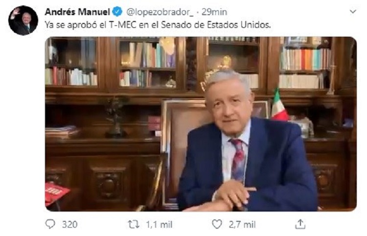 El nuevo acuerdo comercial, recalcó, ya está aprobado por el gobierno de Estados Unidos, tanto en la Cámara de Representantes como en el Senado, y pasa al Parlamento en Canadá donde «los pronósticos son de que no va a haber problema», indicó en un video en redes sociales el presidente.