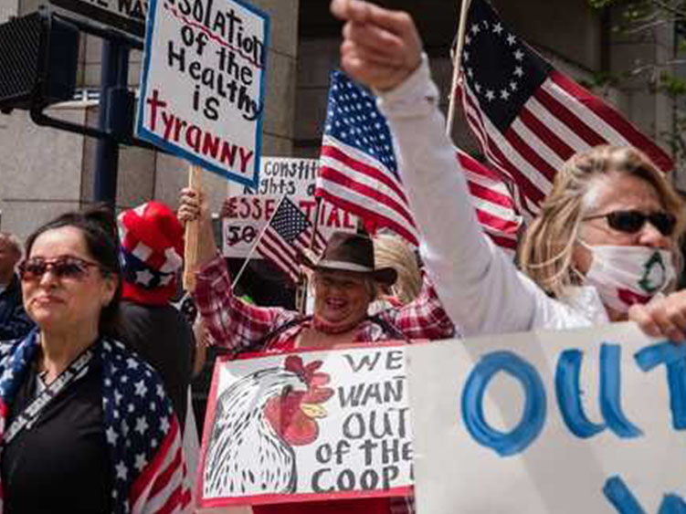 En Austin, Texas, Alex Jones, fundador del portal de noticias Infowars, vinculado a la ultraderecha, arribó a una concentración de unas 250 personas lanzando consignas con un megáfono desde la parte descapotable de una camioneta con blindaje y diseño estilo militar, lo que provocó gritos de júbilo de los asistentes: ¡Estados Unidos, Estados Unidos, déjenos trabajar!