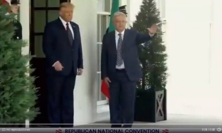 En el promocional de campaña que se dio a conocer durante la última noche de la CNR, Trump habla de sus éxitos comerciales como presidente y al hacer referencia al Trato de comercio México-Estados Unidos-Canadá (TMEC), se presenta una breve imagen con López Obrador, ambos saludando al momento en que recibió al mandatario mexicano en la Casa Blanca.