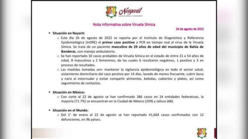 Un caso de viruela Simica se detectó en Bahía de Banderas, con lo que se confirma el primer caso en el Estado de Nayarit, según lo dio a conocer por las autoridades por medio de un comunicado.