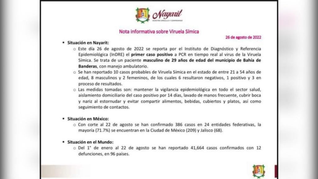 Un caso de viruela Simica se detectó en Bahía de Banderas, con lo que se confirma el primer caso en el Estado de Nayarit, según lo dio a conocer por las autoridades por medio de un comunicado.
