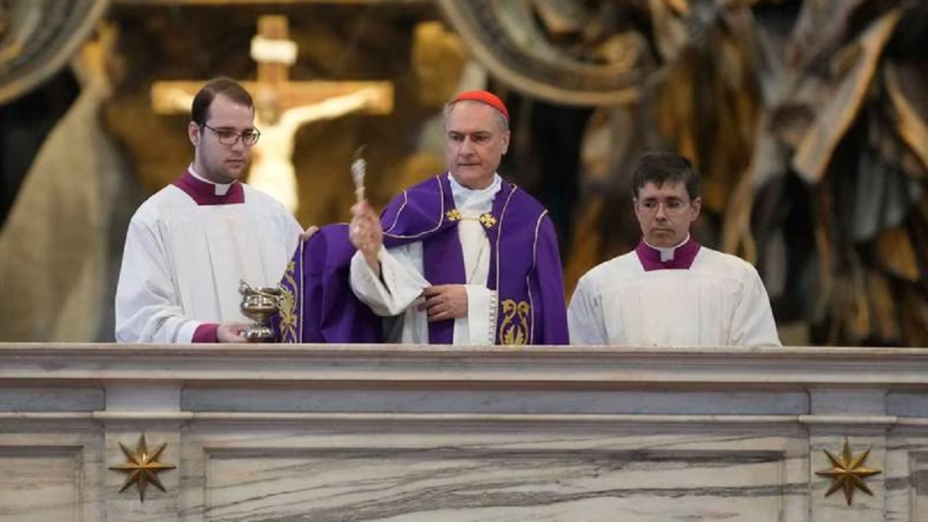 El cardenal Mauro Gambetti ofició el rito de penitencia después de la profanación del altar, acompañado de otros sacerdotes y algunos fieles.