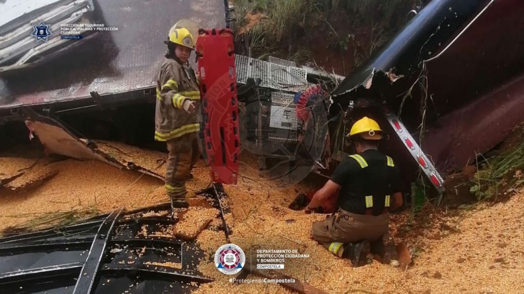 La Dirección de Seguridad Pública, Vialidad y Protección Ciudadana de Compostela a través del Departamento de Protección Ciudadana y Bomberos, informó que atendieron el reporte de una volcadura de un tracto camión en el kilómetro 54 de la autopista Jala-Compostela, en el municipio de Compostela.