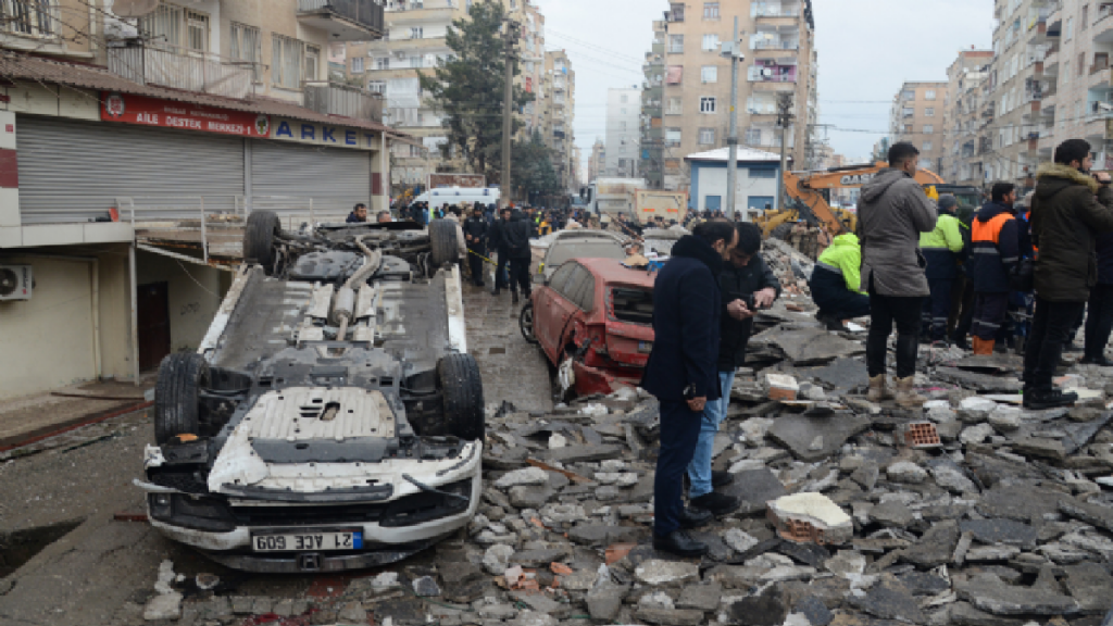 Más al este, en Diyarbakir, grúas y equipos de rescate trabajaban en una pila de pisos de concreto amontonados que antes eran un edificio de apartamentos.