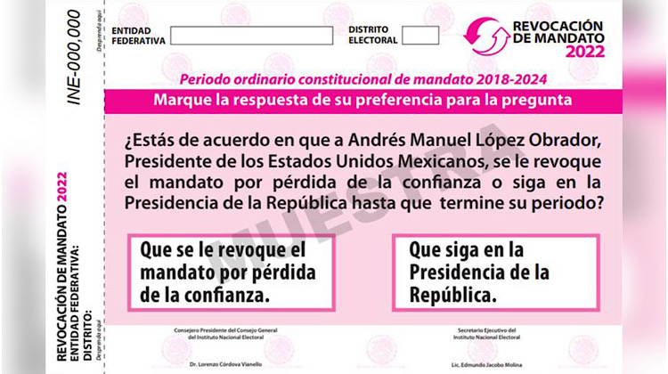 El Instituto Nacional Electoral (INE) aprobó este viernes la boleta que se utilizará en caso de que se apruebe un proceso de revocación de mandato en contra del presidente Andrés Manuel López Obrador.