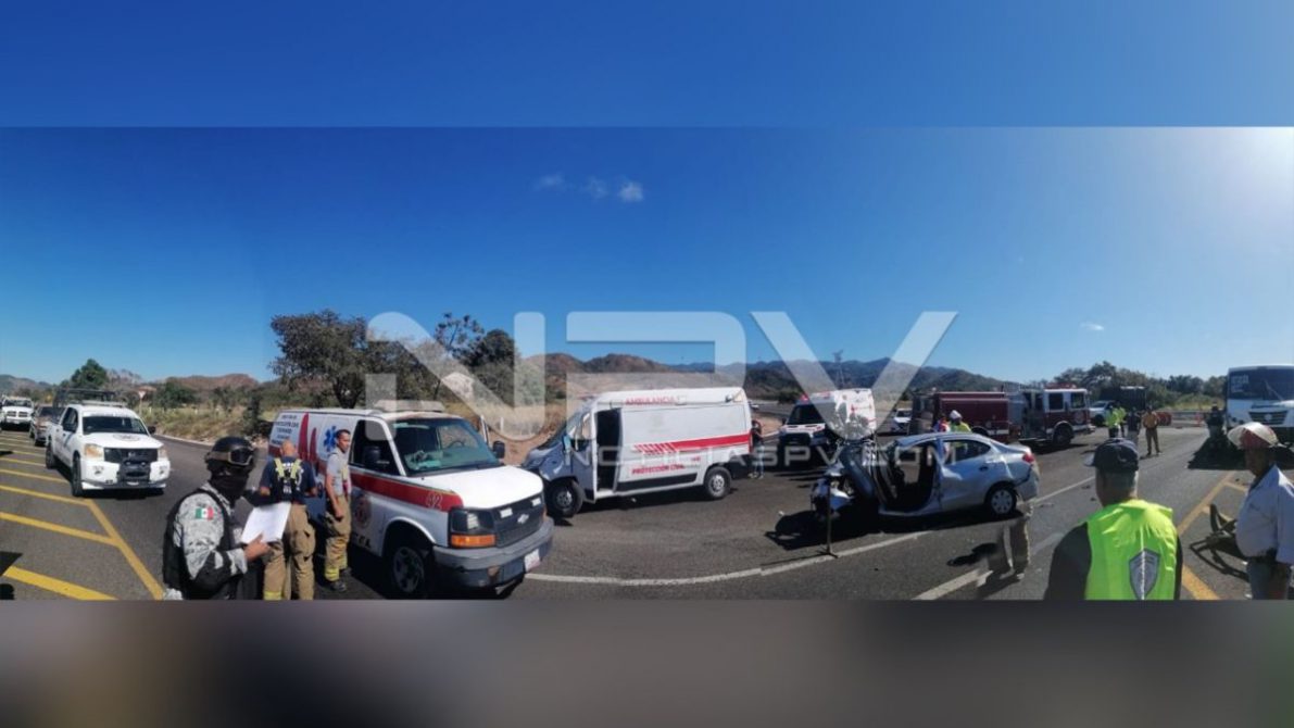 Brutal accidente se registró entre un auto compacto y un camión de pasajeros, sobre la carretera federal 200 en el entronque carretero de la autopista Jala Puerto Vallarta, localmente conocido como el entronque Monteón.