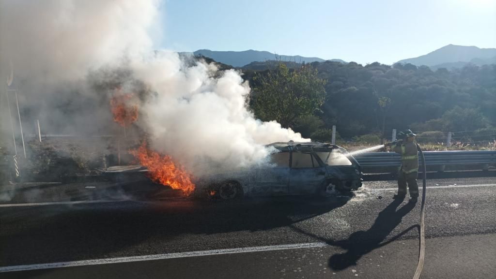 Tepic, Nayarit; 08 de enero de 2023.- En atención a un reporte recibido a la línea de emergencias 9-1-1, donde se mencionara el incendio de un vehículo en la autopista Jala – Compostela, sobre el kilómetro 9+800.