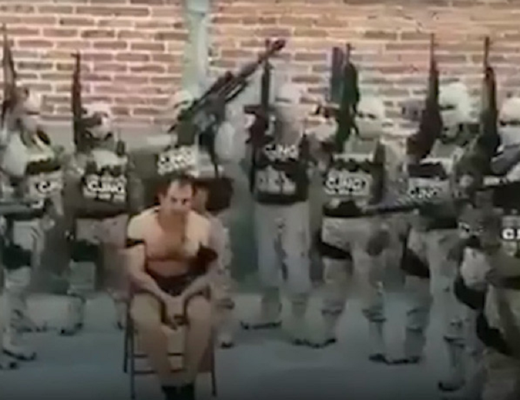 Diez personas enmascaradas, uniformadas y armadas con fusiles automáticos que se identifican con las iniciales del Cártel Jalisco Nueva Generación (CJNG), rodean a un individuo, supuestamente Adolfo Mendoza Valencia, conocido como el Michoacano, uno de los líderes del cártel de Santa Rosa de Lima.