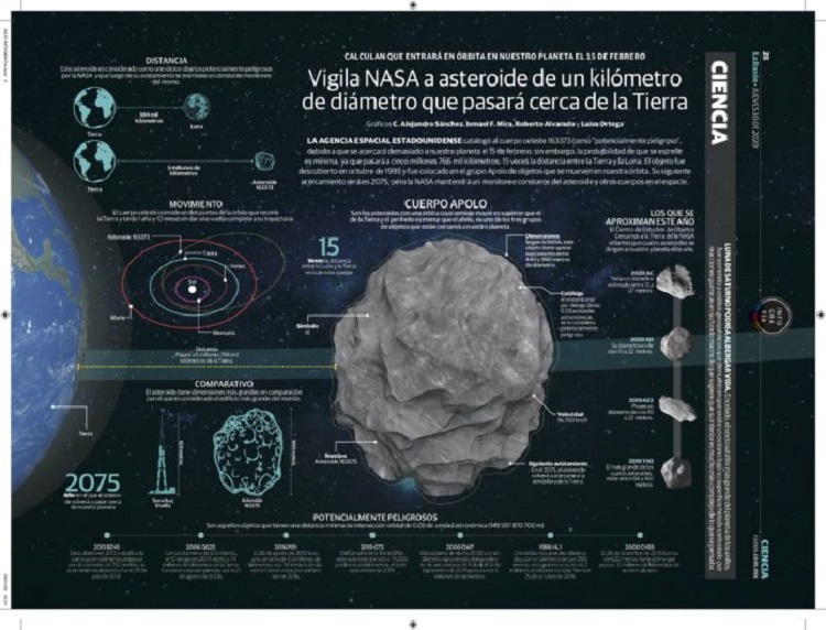 La agencia espacial estadounidense catalogó al cuerpo celeste 163373 como “potencialmente peligroso”, debido a que se acercará demasiado a nuestro planeta el 15 de febrero; sin embargo, la probabilidad de que se estrelle es mínima, ya que pasará a cinco millones 766 mil kilómetros; 15 veces la distancia entre la Tierra y la Luna. El objeto fue descubierto en octubre de 1995 y fue colocado en el grupo Apolo de objetos que se mueven en nuestra órbita. Su siguiente acercamiento será en 2075, pero la NASA mantendrá un monitoreo constante del asteroide y otros cuerpos en el espacio.