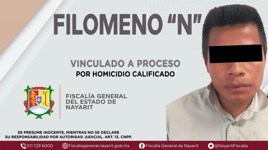 Comunicado.- La Fiscalía General del Estado obtuvo por parte de un Juez de Control auto de vinculación a proceso contra Filomeno “N”, por su probable responsabilidad penal en hechos que según la ley señalan como delito de homicidio calificado, cometido contra un hombre que se desempeñaba como maestro bilingüe en la zona serrana del municipio Del Nayar.