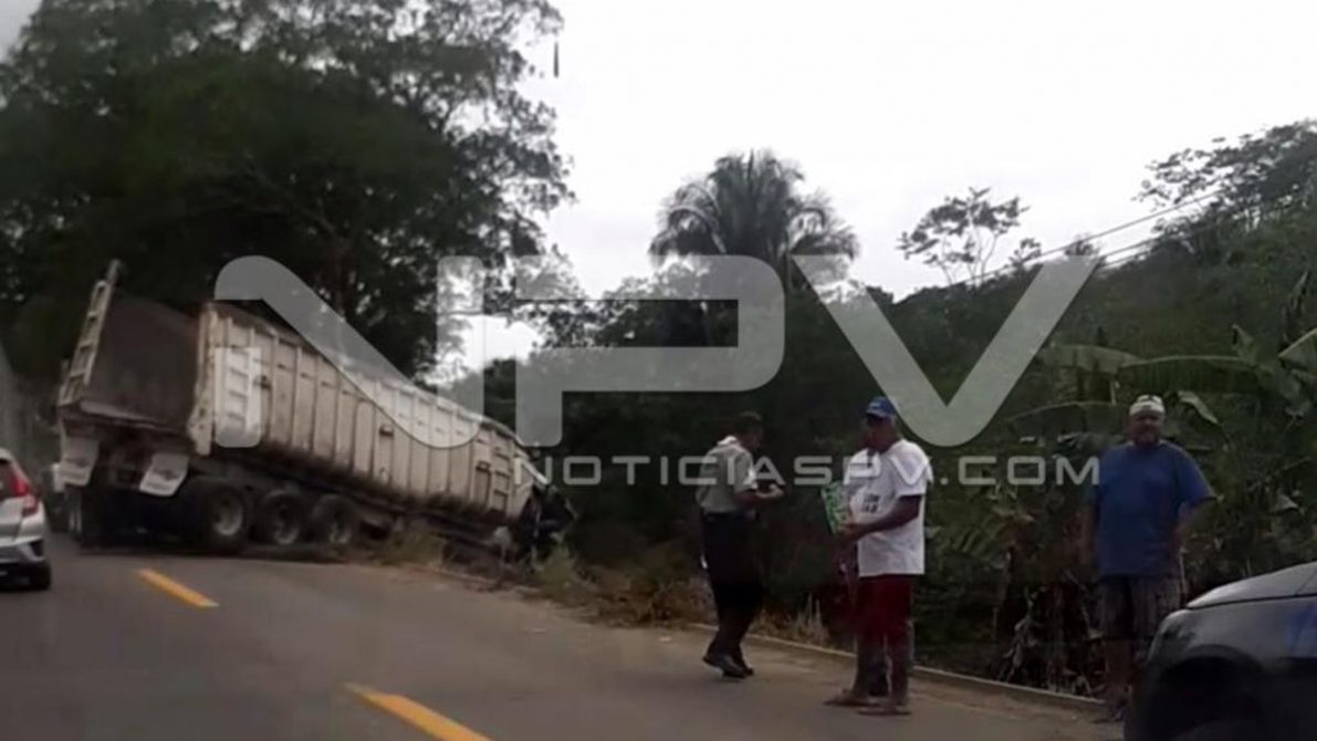 Aparatoso accidente se registró sobre la carretera federal 200, en donde las autoridades reportan la volcadura de un trailer cargado de jal, esto cerca del crucero de San Pancho con dirección hacia lo de Marcos en Bahía de Banderas, Nayarit