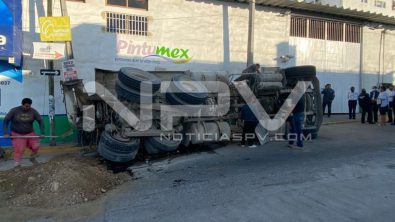Aparatosa volcadura de un «trompo» cargado de concreto se registró en Mezcales, hasta donde arribaron los agentes viales a tomar conocimiento del accidente ya que el pesado vehículo concretero causó daños a la finca de un negocio de pinturas, donde afortunadamente no se reportaron lesionados.