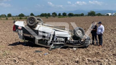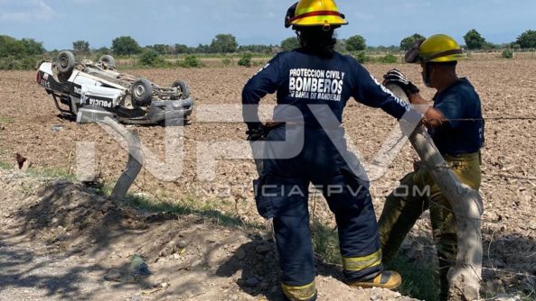 Patrulla de la Dirección de Seguridad Pública Municipal de Bahía de Banderas, termino volcada en un potrero luego de que su conductor perdiera el control de la misma, resultando lesionados los agentes policíacos, quienes fueron auxiliados y trasladados a recibir atención médica a un hospital.