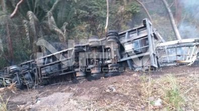 Comenta el mismo conductor que al ir circulando por el carril de sur a norte de la carretera federal 200, al llegar al kilómetro 109+00 perdió el control ya que venía cargado de maíz, terminando volcado en un barranco donde el trailer empezó a arder en llamas.
