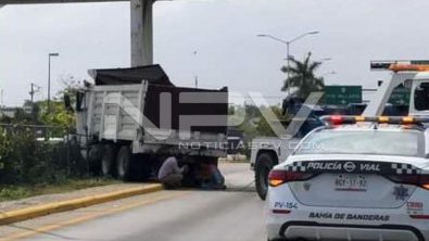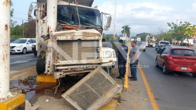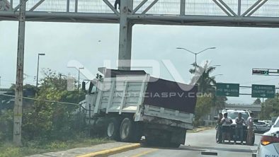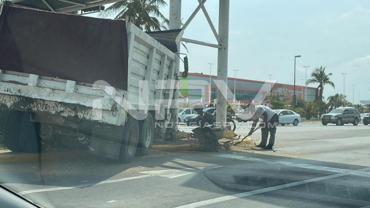 Brutal accidente se registró la mañana de este miércoles sobre el Boulevard Riviera Nayarit, frente a la Mega de Bucerías, en donde un camión tipo volteo que se quedó sin control, se estrelló contra la estructura metálica de un puente a la altura de los semáforos de la Mega Flamingos