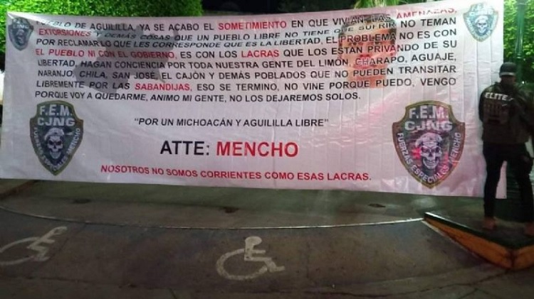 “Pueblo de Aguililla, ya se acabó el sometimiento en que vivían, las amenazas, extorsiones y demás cosas que un pueblo libre no tiene que sufrir. No teman por reclamar lo que les corresponde que es la libertad”, dice la manta firmada por “Atte: Mencho”.