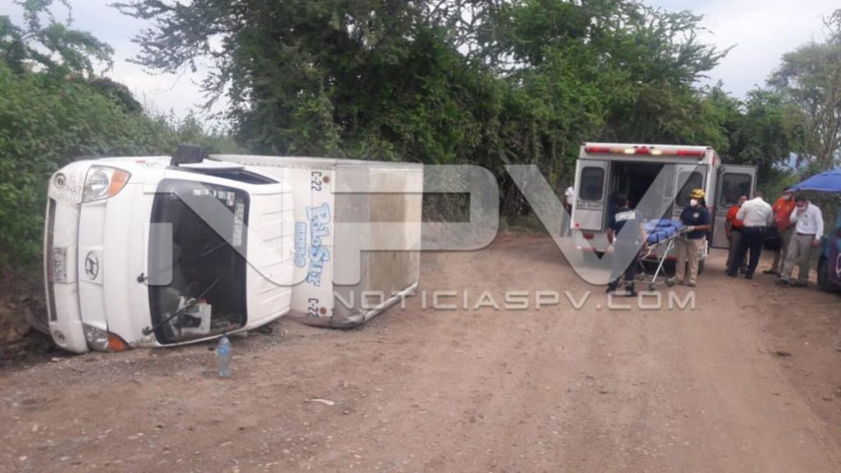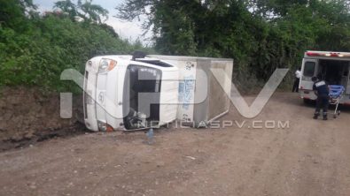 Aparatosa volcadura se registró la mañana de este miércoles sobre la brecha que lleva de Jarretaderas hacia el boulevard Federaciones, en Bahía de Banderas, en donde un camión repartidor de hielo se quedó sin control y terminó volcado.