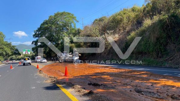 En el sitio se registró la volcadura de una cisterna que transportaba Melaza, misma que quedó regada en la carpeta asfáltica.