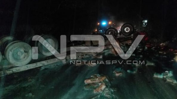 Brutal volcadura de un trailer procedente de la ciudad de Guadalajara, se registró la madrugada de este martes sobre la carretera federal 200 entre la virgencita y el poblado de Mesillas.