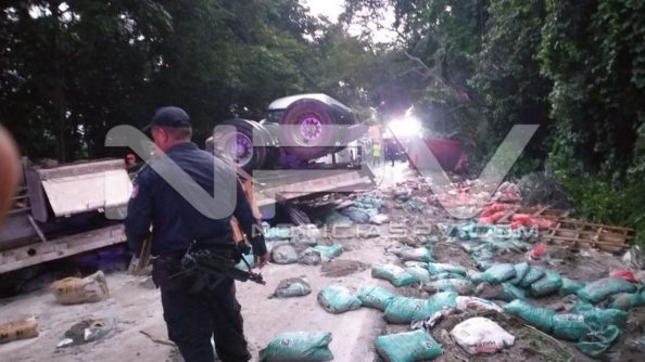 Brutal volcadura de un trailer procedente de la ciudad de Guadalajara, se registró la madrugada de este martes sobre la carretera federal 200 entre la virgencita y el poblado de Mesillas.