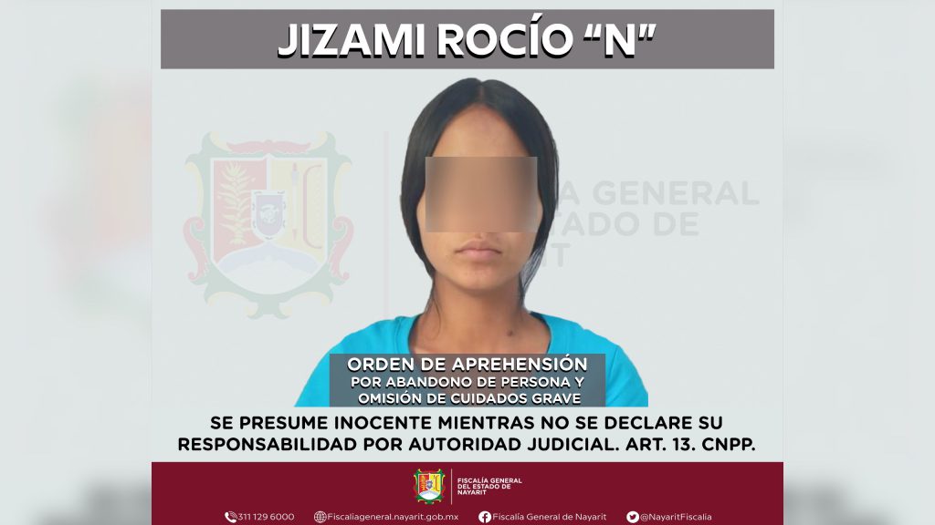 El comunicado que no revela dónde ni cómo fue detenida la mujer, señala que en el interior del Centro de Reinserción Social Femenil -CERESOFE- «La Esperanza”, elementos de la Agencia de Investigación Criminal de Nayarit ejecutaron una orden de aprehensión contra Jizami Rocío “N”, por su presunta participación en hechos que bajo la apreciación de la ley configuran los delitos de abandono de persona y violencia familiar en su modalidad de omisión de cuidados grave, cometidos en agravio de un recién nacido.
