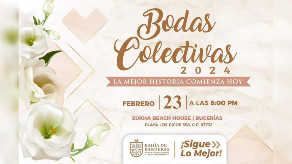 Bahía de Banderas, Nay., 5 de febrero de 2024.- El gobierno de Bahía de Banderas convoca a las parejas que deseen contraer matrimonio civil a las Bodas Colectivas que se llevarán a cabo el próximo 23 de febrero del año en curso.