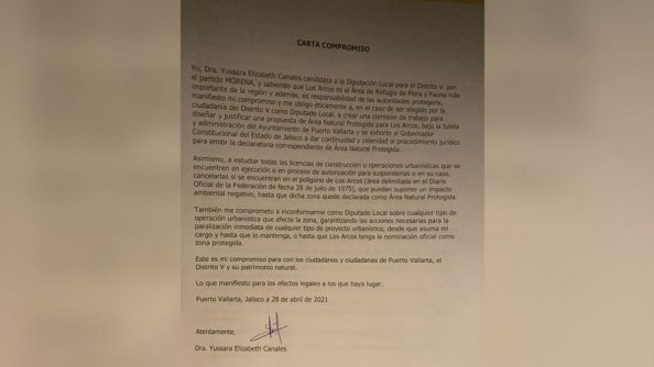 La doctora Yussara Canales abandera del MORENA por la diputación local del Distrito 05, la mañana del día de ayer se reunió con representantes activistas medioambientales, quienes promueven la protección y conservación del Parque Nacional Marino “Los arcos de Mismaloya” con quienes acordó y firmó pacto, en el cual, al ser favorecida en la contienda, se compromete a diseñar y justificar una propuesta de Área Natural Protegida para los Arcos y bajo la tutela Constitucional del Estado de Jalisco, dar continuidad y celeridad al procedimiento jurídico para emitir la declaratoria correspondiente de Área Natural Protegida.